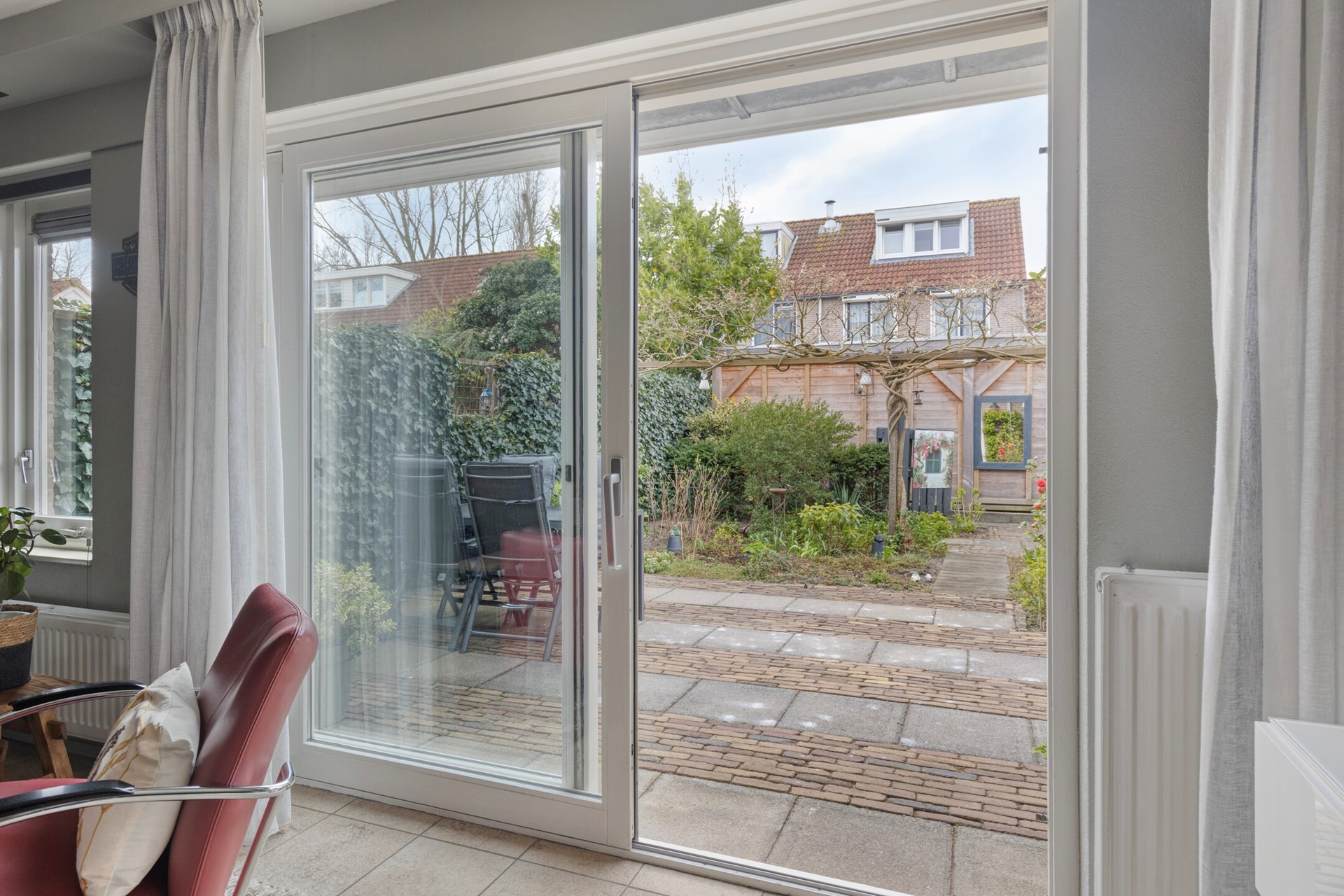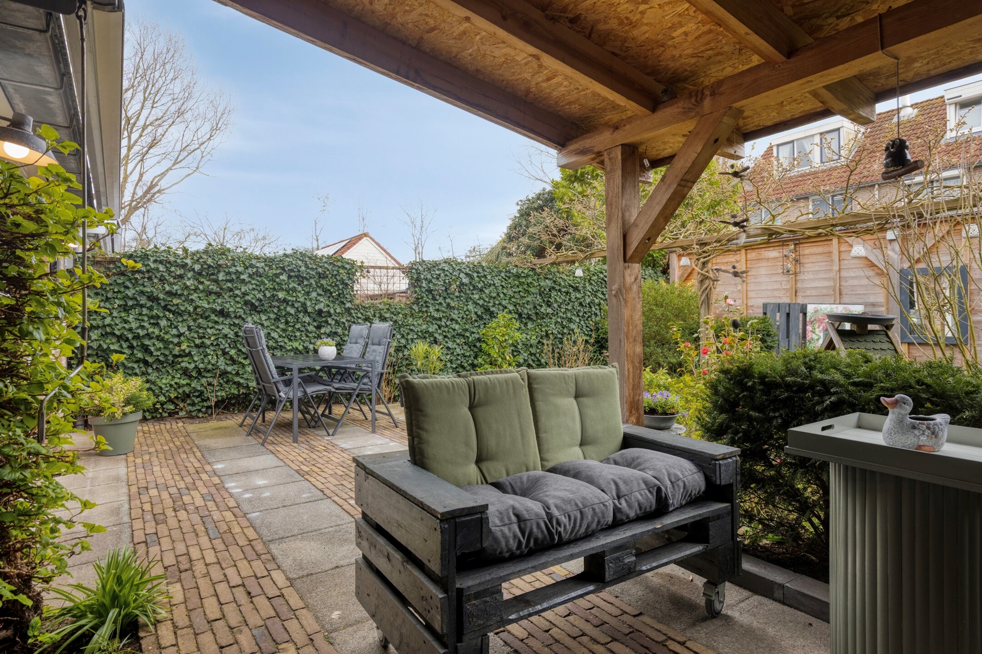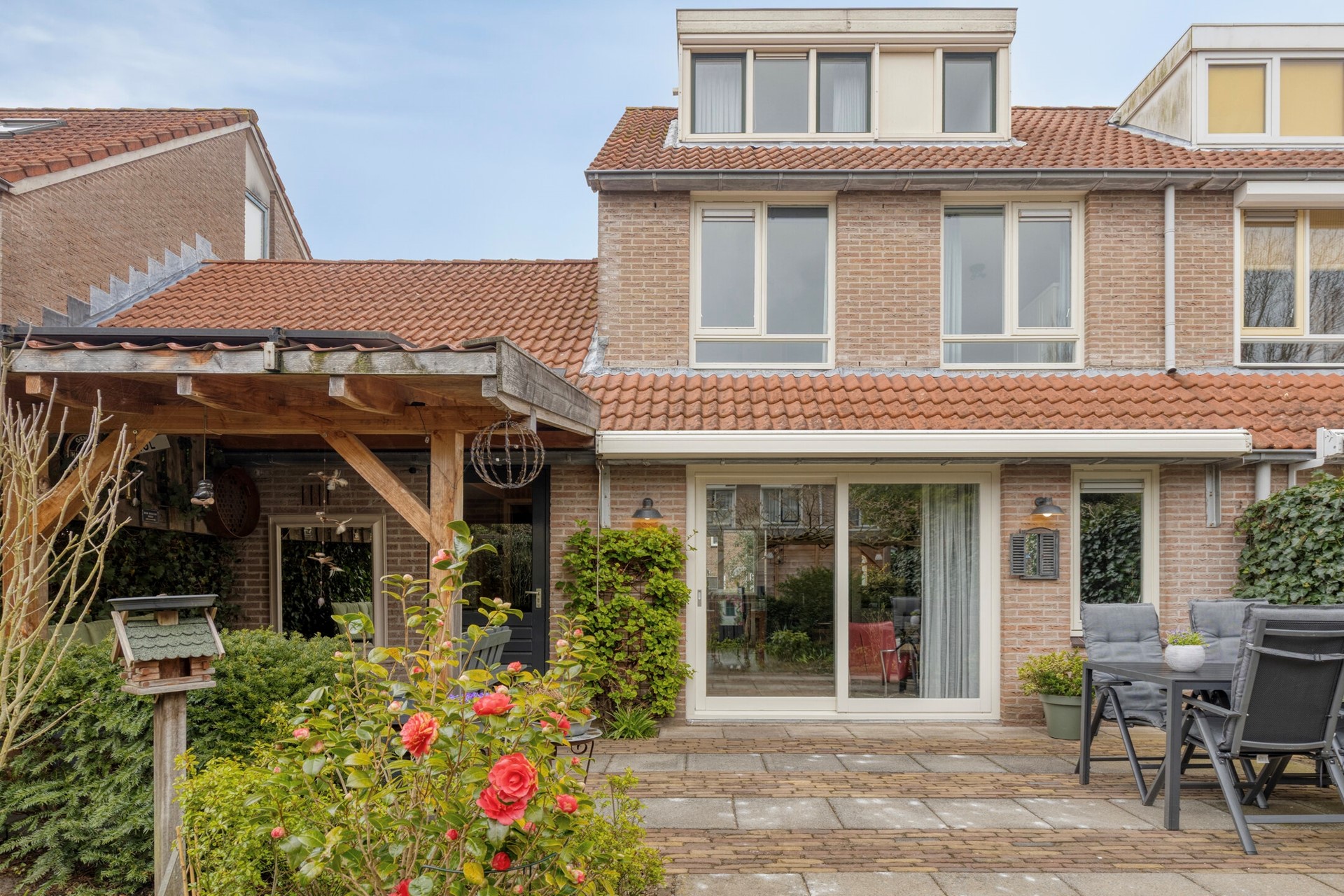 De achtertuin is fraai aangelegd met groen, een overdekt terras en een zonnige ligging op het zuidwesten. Hier kunt u vrijwel de hele dag genieten van de zon en in alle rust ontspannen, eten of gezellig samen zijn met familie en vrienden.