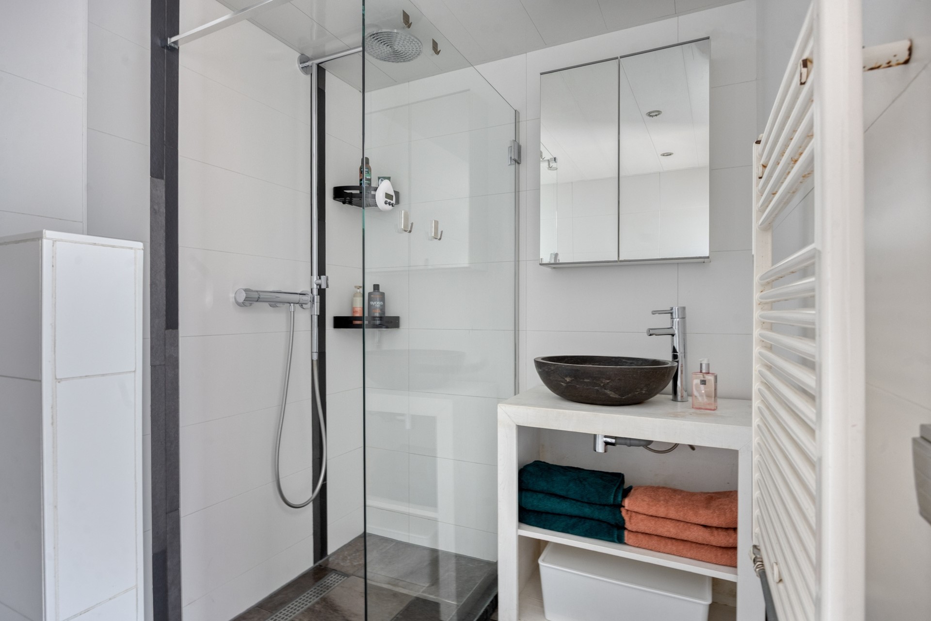 De badkamer is netjes verzorgd en voorzien van een douche, een wastafel met spiegel en toilet. Alles is functioneel ingericht en praktisch in gebruik. Daarnaast beschikt het appartement op de begane grond over een verrassend grote berging, ideaal voor het stallen van fietsen, het opbergen van seizoensspullen of andere extra bergruimte die altijd welkom is.