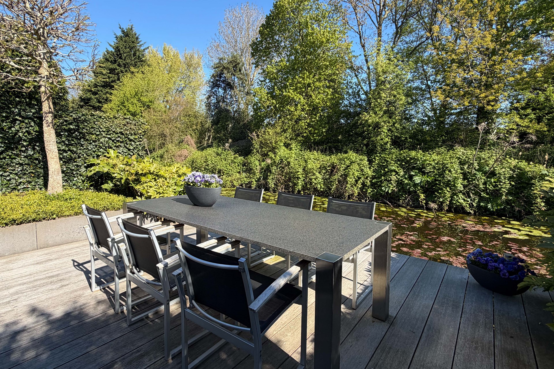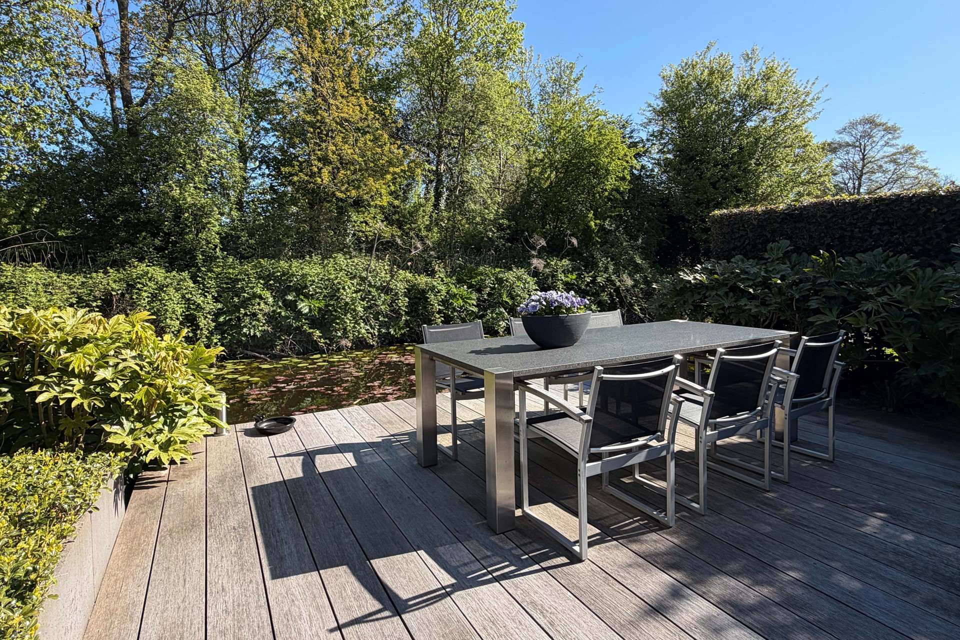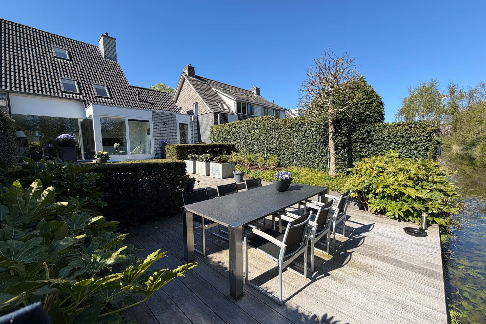 De achtertuin vormt zonder twijfel een van de hoogtepunten van deze woning. Deze is fraai aangelegd met diverse beplanting, meerdere zitplekken en een terras direct aan het water. Dankzij de eigen steiger geniet u hier in alle rust en privacy van het buitenleven, de natuur en het water, een unieke plek om te ontspannen of lange zomerdagen door te brengen.